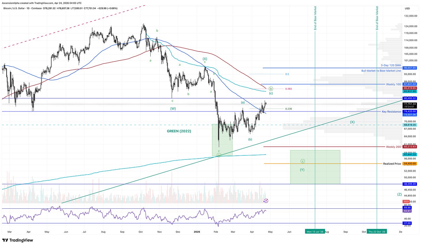 The current move still looks more like a bear flag than the start of a new impulsive bull leg higher. Even a 40 to 45 percent rally off the lows, pushing into the $85,000 area and the 200-day SMA, would be very typical of a bear market bounce before another leg lower. We saw this exact pattern play out multiple times in the previous cycle. If history continues to rhyme, a bottom would likely form sometime between July and October of this year, leaving plenty of time for another move down.
