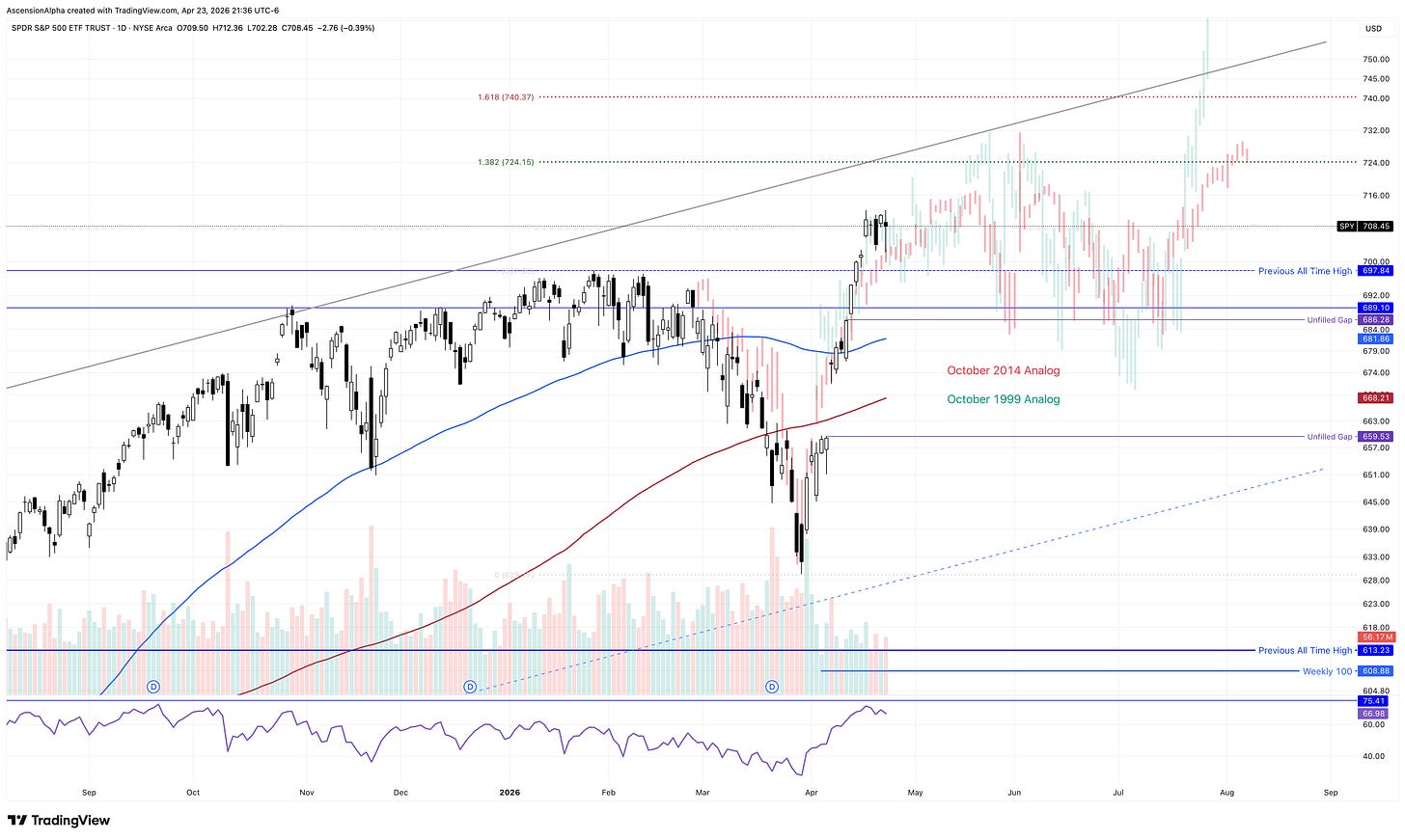 For that reason, I think pullbacks remain shallow in the near term. That said, we likely continue to follow the 1999 and 2014 analogs to some extent, where price eventually does retrace back toward the 100-day SMA and the $686 gap, possibly even a bit lower. The main wildcard in the immediate future is earnings season. The market seems to have largely shrugged off the Iran war and any other concerns for now, so the next real catalyst will likely come from earnings and forward guidance. Inflation or macro shocks could still matter, but those are more likely to become factors later in the summer. Let our futures selves deal with that mess.