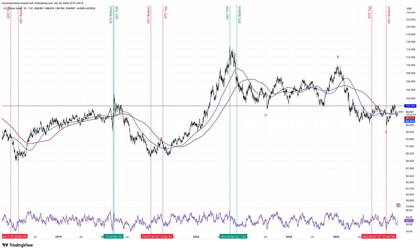 The DXY adds another layer to watch. It has always moved inversely to Bitcoin, and it currently appears to be attempting a base after nearly a year of consolidation. A breakout higher in the dollar could tighten global liquidity and apply additional pressure on risk assets, especially BTC.