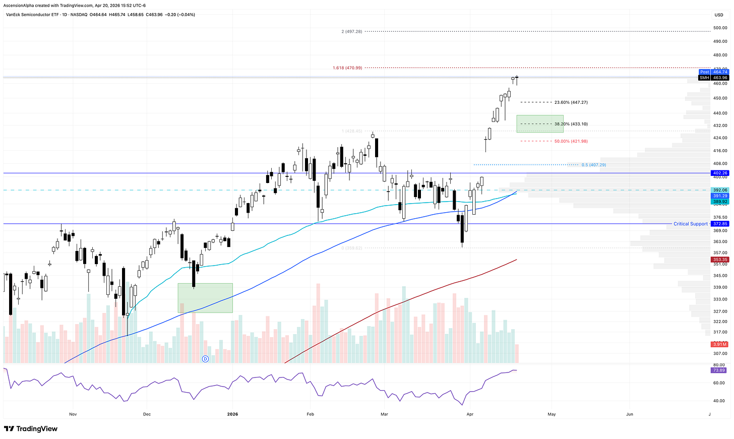 SMH is approaching its 161.8% extension of the March drop near $470. That level should act as a reasonable resistance target for the market leading ETF, especially if price can reach it this week. This would likely coincide with NVDA filling its gap at $205.56. From there, I would expect a pullback toward the $430 area on SMH, followed by another push higher, potentially into the $495 to $500 range. I’ll be watching these levels closely and looking for opportunities to position for the next leg up.