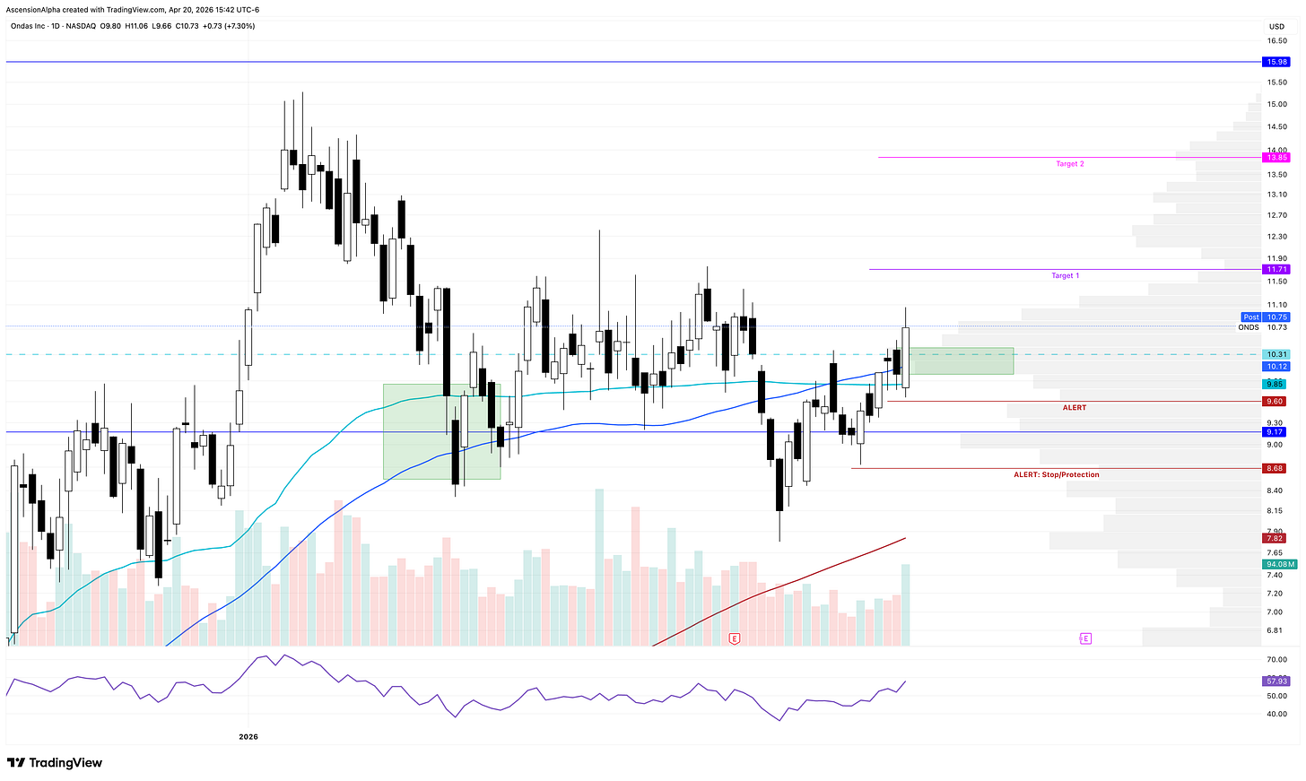 If it pulls back and retests the 100-day, that could still offer a solid entry since this name has been chopping around quite a bit recently and I don’t expect the next move to be straight forward. There’s a bit of a double bottom forming on the daily, and we just saw a notable volume spike. Given how volatile ONDS is, a push to new highs is definitely not out of the question if given enough time.