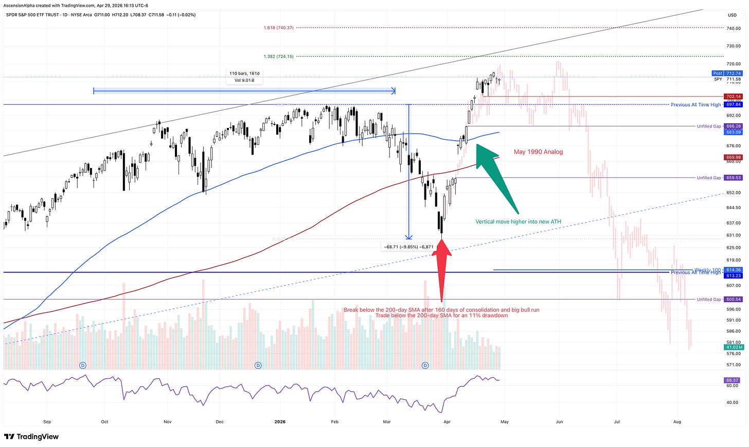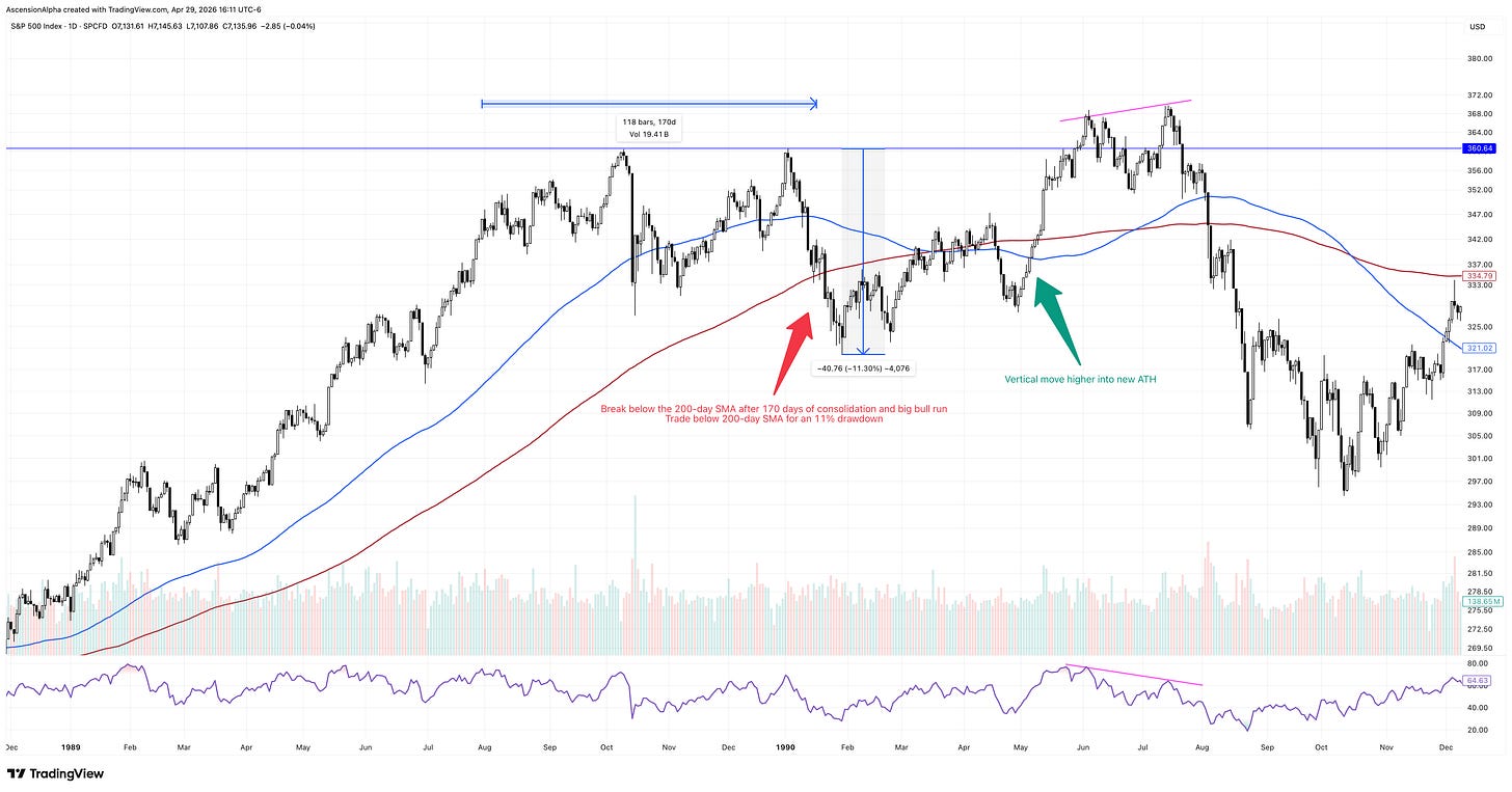 Our current price action has a lot of similarities to that 1990 structure. We rallied hard for a year in 2025, consolidated for around 160 days, broke below the 200-day, then reclaimed it and pushed vertically to new highs.