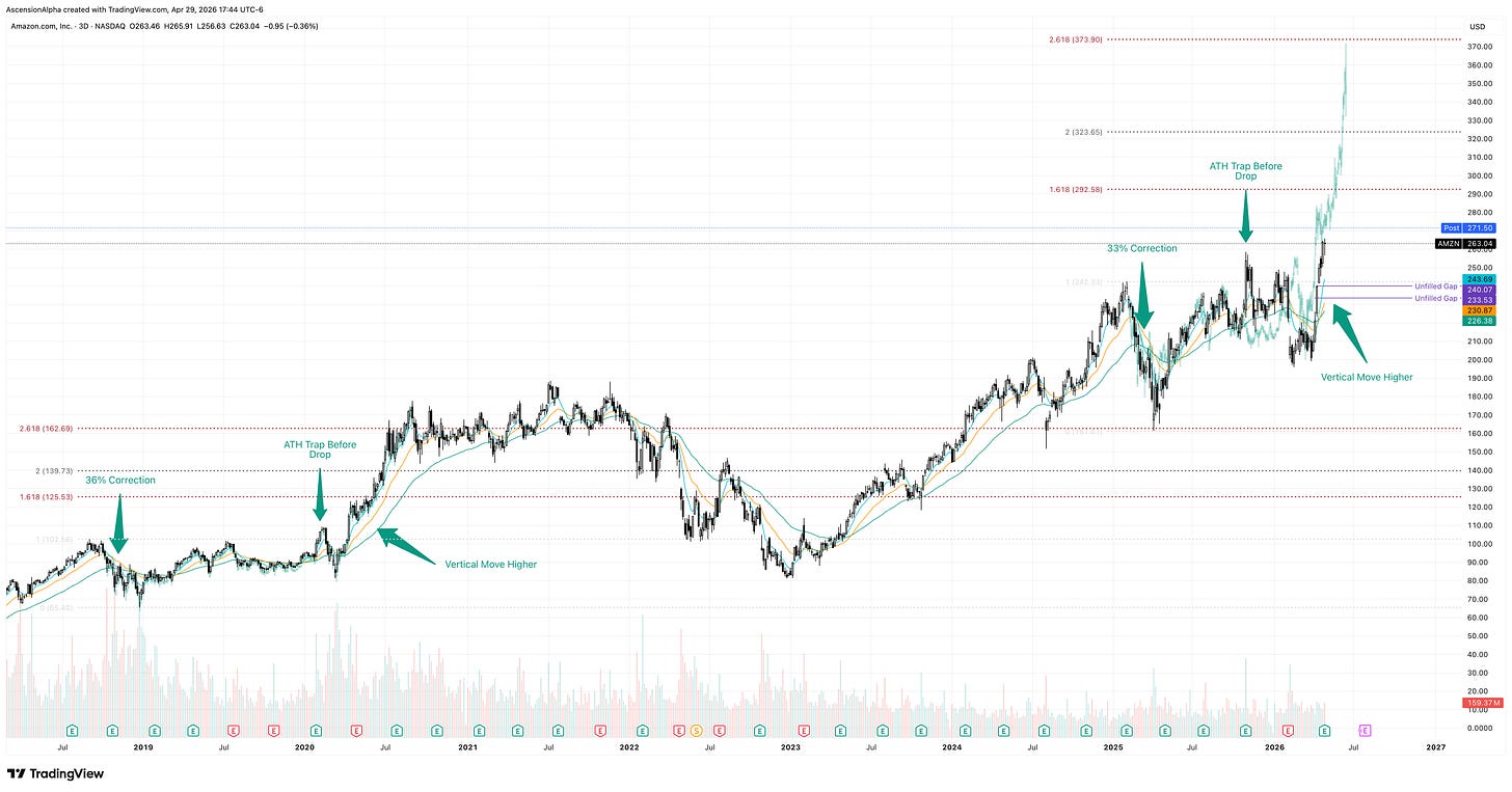 This market continues to reward strength and punish weakness. GOOGL and AMZN have been ripping into new all-time highs and are both gapping higher again. AMZN is continuing to track the 2019–2020 analog I shared in mid-April, which highlighted the strong similarities between those periods and pointed to significantly higher price targets. Because of that analog, I started adding back into an AMZN position after selling too early in this rally.