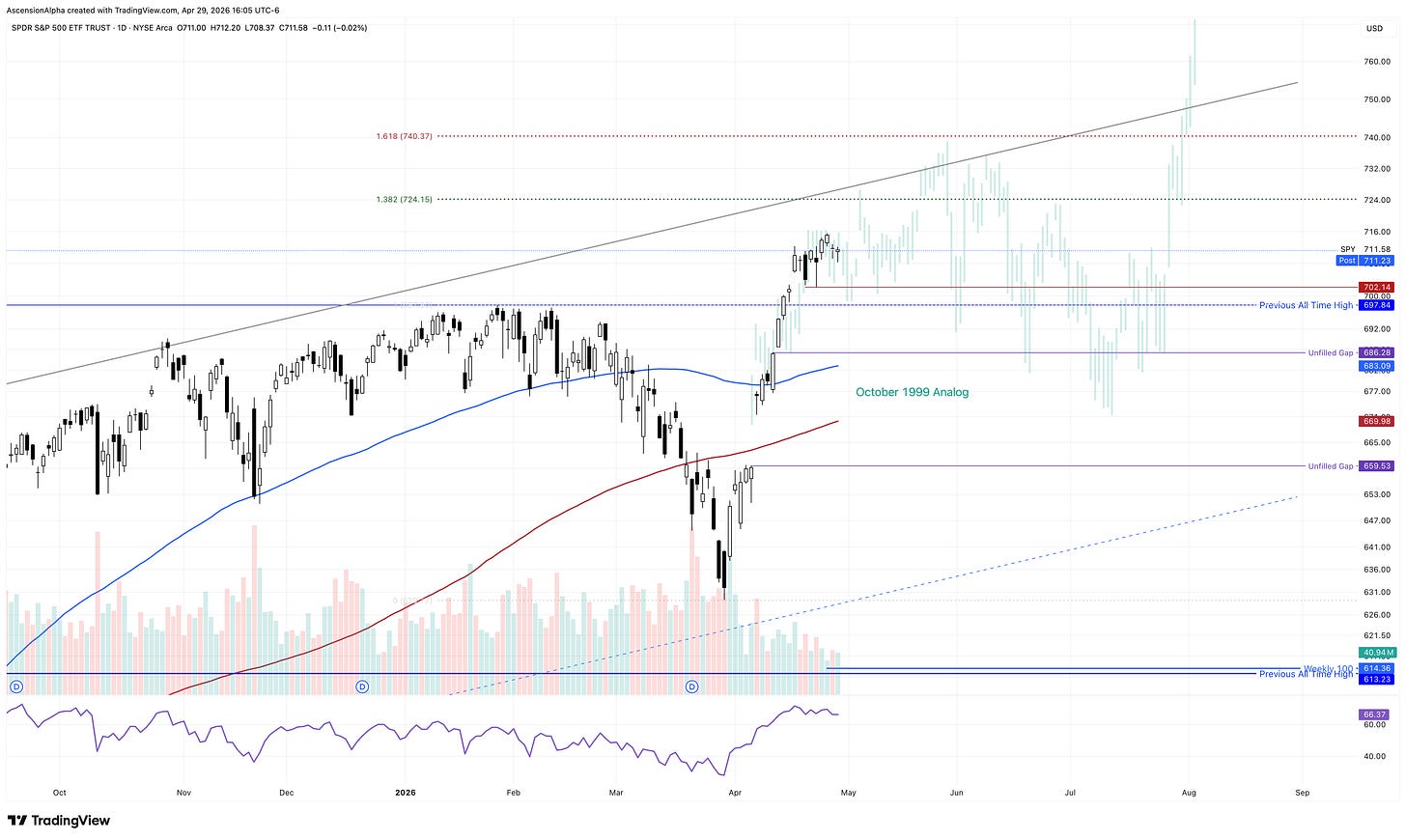 The main analog I’ve been focused on for weeks is the 1999 October setup, which continues to track well. That scenario calls for some choppiness over the next couple of weeks, but with only shallow pullbacks that get bought up quickly. From there, it points to a push toward the $730 level on SPY before any real volatility enters the picture. After that, we would expect a more meaningful correction, followed by another bullish leg higher into late summer or early fall.