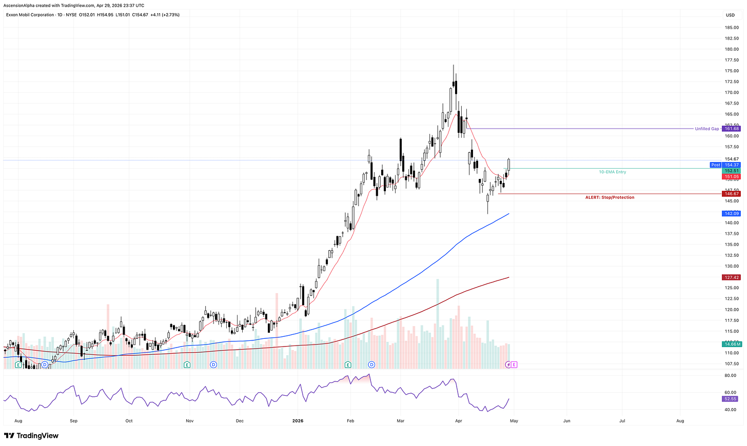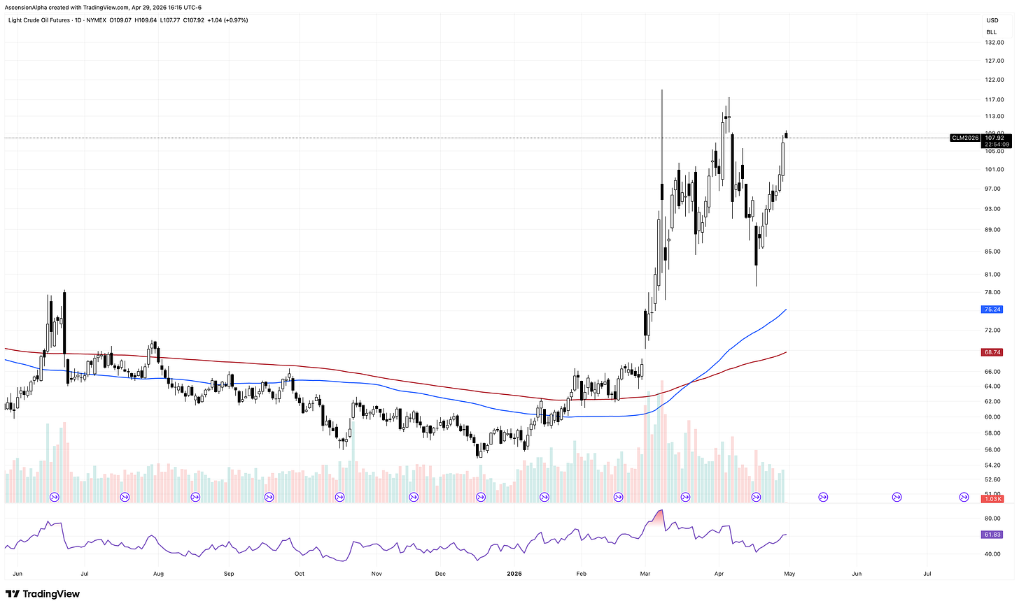 A simple way to gain exposure to the move in oil, if you’re not trading futures, is through XLE or its top holdings like XOM, CVX, and COP.