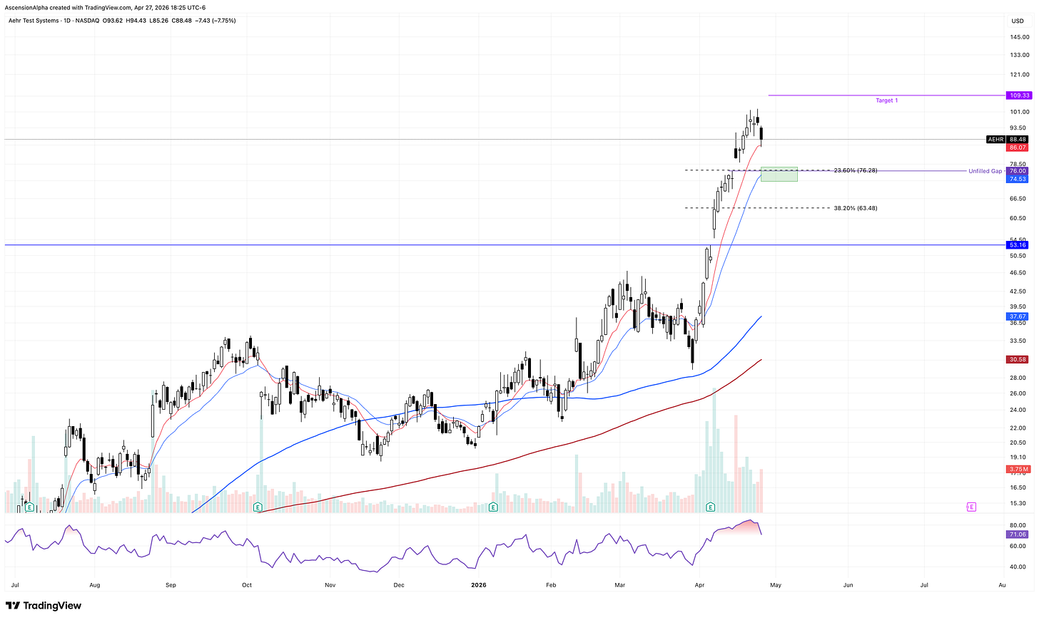 If AEHR pulls into that 20 EMA in a controlled way, I could easily see one more leg higher, potentially pushing toward $110. That’s roughly a 45% move from the $76 gap-fill area. My plan will be to watch for strength at the 20 EMA and enter on confirmation on lower timeframes like the 30- or 65-minute charts. A break and close below the 20 EMA would invalidate the short-term bull thesis.