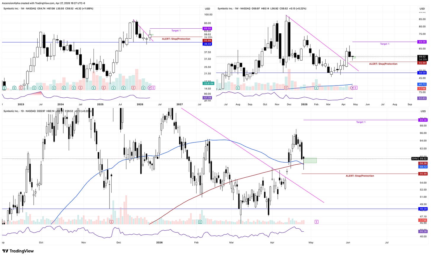 Zooming out, SYM has a large double bottom on the monthly followed by a developing bull flag right at resistance. If this breaks out, it has the potential for a sustained move higher over time.